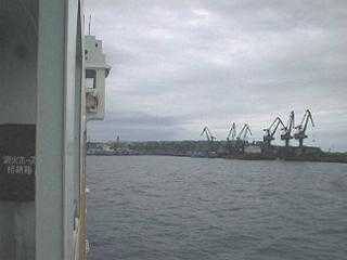 午後3時過ぎ、コルサコフ港が見えてきました。5時間の航海は長いような短いような不思議な時間でした。3:30、着岸するというアナウンスがありました。続いて「ロシア側の船内手続きにしばらくかかる」という説明も。