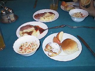 ホテルは道路一本を隔てて海があり、裏は宗谷半島の丘陵です。和風でこった内装のフロントに入り、チェックインします。部屋は一階の102号室で、狭く感じる6畳和室。テーブルに食事が用意されていました。事前に「夕食には間に合いませんので」と断ったはずなのでびっくりです。 |