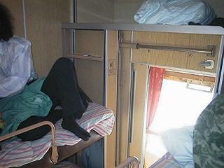 2号車の改札係はまだ若い女性で、でも顔も体型もフルシチョフに似ています。チケットとパスポートを見せて車両に乗り込みます。1室上下段4人の寝台です。ここにも番号などはなく、どのコンパートメントに入ればいいのかわかりません。チケットには小さな数字が並んでいるだけです。どれが何を記しているのかさっぱりです。しかたなく、後方の廊下に立っていた若い髭の青年にチケットを見せて「グゼー・エータ?(これはどこ?)」と訊ねました。彼は親切にも車両を横断して2番目のコンパートメントまで来て、「ここだ」とジェスチャーで示しました。部屋を覗き込むと、二人の中年に近い女性がいました。彼女たちは下の座席のテーブルに向かい合っていて、私たちの席は上だと言います。二人連れの席が上の二つというのは不自然ですが、そう言われれば従うしかありません。違っているなら車掌がそう言うだろう、と思って梯子を引き出し、二人とも上の寝台に上がりました。とりあえず旅の寝床は確保したわけです。