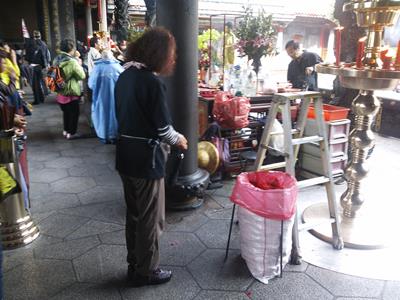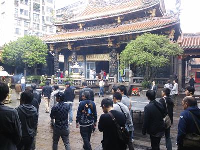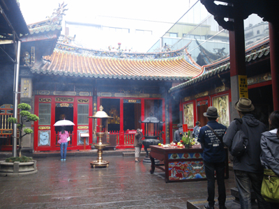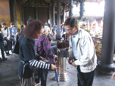| 8:40、迎えの車で台北市内観光へ。 ガイドはSさんと言い、姿も話し方も俳優の北村総一朗さんにそっくり。日本での留学体験もあり、確かな日本語を話す。ちょっと片足を引きずっている彼に導かれて午前中は台北南側の観光地を巡回。 最初は中心部の議事堂や総統府を窓外に眺め、台北最大の寺院「龍山寺」へ。この寺は本堂以外にたくさんのお堂を持っており、様々な神仏を祭っている。さながら寺社のデパート。ここだけで市民のすべてのニーズに応えられるらしい。台湾人の信仰も篤く、連日繁盛しているようだ。 |