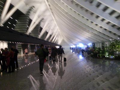 | 約四時間の飛行の後、台湾島の光が見え始めた。全体的にオレンジ色だ。街灯などにオレンジが多く使われているらしい。なんとなく昭和の日本の夜景を思わせる。 やがて台北市上空に入り、101タワーを中心に広がる市街が見えてくる。飛行機はそこを通り過ぎて隣りの桃園空港に着陸。台北空港だと思っていたのにホテルまで車で一時間かかった。ただ、ここはかなり大きな国際空港として再開発されているらしい。広くて(下・左)近代的な構造になっている。(下・右)私たちは到着後、さっそく空港内の両替店で1万円分の台湾圓を両替した。 |