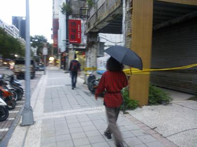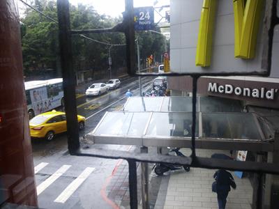 | 端っこの席でフルーツとパセリのサラダを食べながら、窓から道路を見下ろすとかなりの雨。寒いというほどではないが、南国を予想してきたこちらとしては意表を突かれた。歩いている人たちはぴっしり上着を着込んでいる。台湾でも11月は秋の風情なのだ。 とはいいつつ、持ってきた短パン・半袖を着ないのもなんだから着ていく。 |
