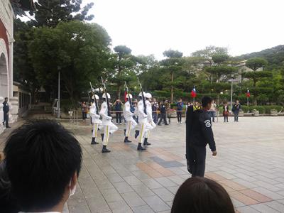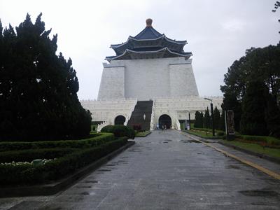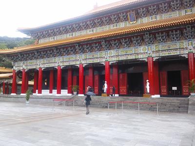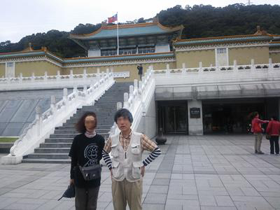 | 午後は台北北部の観光になる。大桂河を越えて「台湾の靖国」忠烈祠へ。ここもでっかい建物だ。(上・左)二時間おきに番兵が交替する、その儀式を見るためにたくさんの人が集まっていた。(上・右) それから自強トンネルを抜けて観光の大本命たる故宮博物館へ。紫禁城を模したという話だったがそれほど大規模ではない。外は風が強くなってきた。(左) 内部は暗く、迷路のようで、どこに何があるのかさっぱり分からない。Sさんが大まかに案内してくれたのでなんとか全容をつかむことが出来た。中は撮影禁止。(そんなの関係ないんだけど) |