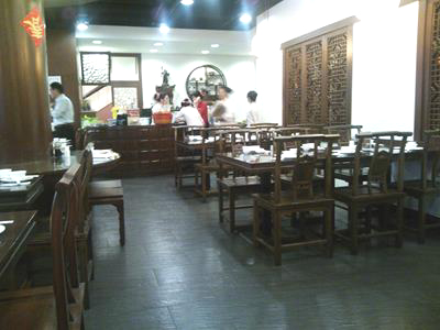 | 明けて11月15日、天気は下り坂。日常では朝食を取らない私たちだが、サラダとお茶くらいは貰おうとレストランへ。 7時にはもうどのテーブルにも人がいる状態。こちらの人の朝は早そうだ。形式はホテルにありがちなバイキング、種類は中国らしい豊富さだが肉料理が多くベジタリアン向けではない。 |