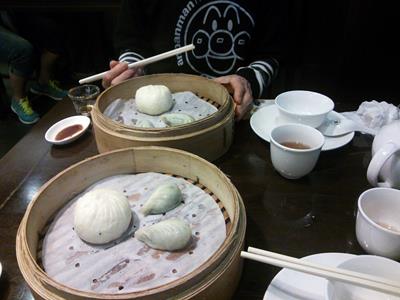 | 昼食の時間になり、Sさんに頼んで連れて行ってもらったのはベジタリアン対応の飲茶(やむちゃ)店。(上・右)野菜だけを使った小籠包(ショウロンポウ)を出してくれた。(左) 食中酒として紹興酒を飲み、Sさんにも勧めたら、 「私もさんざん飲んで、その結果痛風になったんですよ」と引きずっている右足を示した。 |