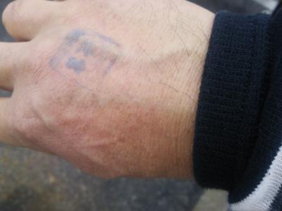 | 一周して一息入れようといったん外へ出る時に、手にスタンプを押される。(右)これが無いと再度入れないらしい。 Sさんは日中戦争で南京、重慶へと疎開した宝物たちが、内戦で再び南京・台北へと運ばれた経過や、二人の日本人が最重要クラスの仏像や陶器を寄付したことなど教えてくれた。 |