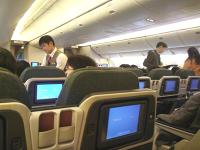 | カウンターで航空券を貰い、手荷物検査は混雑のエコノミー客通路を横目に見ながらVIP通路を通る。そして待ち時間はキャセイパシフィック航空VIPラウンジで。広いが天井が低いので圧迫感がある。飲み物はなんでも揃っていて、ツマミには寿司まである。 けっこう混んでいてどのテーブルも客で埋まっている。大半が中国人らしい。そのうちアナウンスで飛行機が50分遅れることが分かり、待ち時間が2時間近くなった。MemoPadでネットしながらビールを飲み、ワインを飲む。出発前にすっかり酔っ払ってしまう。 |