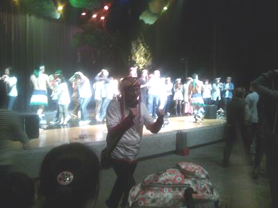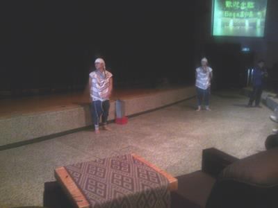 11月16日、天気は持ち直す。 ここでの呼び物は「首狩り族」だった時代を含むタイヤル族の歴史と文化をドラマにした歌舞劇。最後には観客を舞台に上げて集団ダンスになる。(下・左右…内容は撮影禁止) |