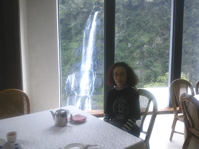 | 実はタイヤル族のステージはかなり強引な商売もしていた。私はうまく逃げたけどかみさんは捕まっていた。(具体的には言わないけど、ヒントは写真) その後、滝の見えるレストランでベジタリアン用の昼食。(上・左)それから滝の前で記念撮影。(上・右) さらにこれが呼び物のトロッコ電車に搭乗。ネット上にある動画で見たよりも小さくて可愛い電車。(下・左右) |
