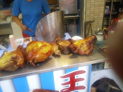 | トロッコの終着点から河を渡ると鳥来温泉街です。ここは九?(きゅうふん、ジォウフェン)と並んで『千と千尋の神隠し』のモデルとなった場所として有名なのだそうだ。(注・ジブリは否定) 浅草仲見世に似た狭い通りを進むと、豚の丸焼きなんてものがあったり(下・右)、雑然としたなかなか楽しい所だった。 |