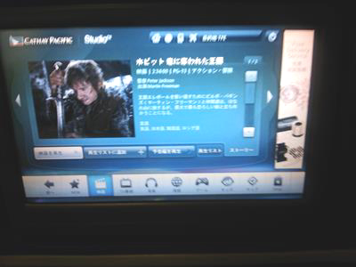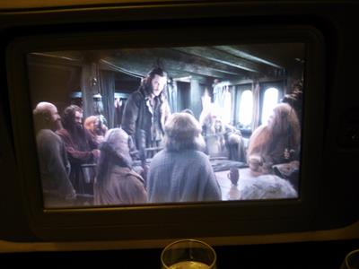 | ようやく搭乗が始まった。キャセイ機にはビジネスクラス席が15列もある。7×15で105シートだ。VIPラウンジが混んでいたはずだ。 さすがに前後の空間は狭く、座席はフルフラットにはならない。それでも各席に個別のスクリーンはあるし、メディアはサービス豊富だ。私はまず「最新映画」を選び、『ホビット・竜に奪われた王国』を見る。(下・左右)しかしひっきりなしのアナウンス、ドリンクや食事サービスのために気が散って集中できなかった。そのうえ、この映画「次号へ続く」になってしまい、尻切れトンボだった。( ゚Д゚)…もう続編が公開中。 |