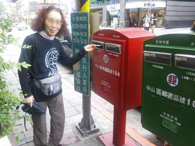 | 午後の早い時間に戻ってきたので私の希望で光華市場探訪へ。 その前に前日購入した絵葉書を投函する。同時に買った切手が料金不足で、追加切手を購入しようとしてひと騒動あった。コンビニの前に車を停めて降りようとしたかみさんの足をSさんがドアで挟み、おわびに買ってくれたのだ。赤いポストが国際便・大型便で緑のポストが国内便。 |