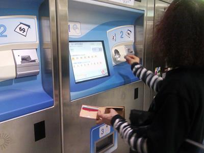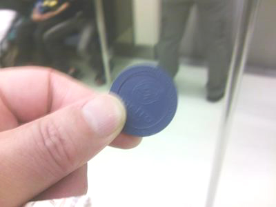 | ホテルから大通りを数分歩くと捷運松江南京駅。階段を降りていくと近代的な地下街が現れた。はっきり言って台北市街は小汚いが、地下は明るく美しい。そのギャップに驚かされる。 自動販売機で切符の代わりになるICトークンを買う。(左)トークンはコイン状のICチケットで(下・左)、使い回しが出来るのだから合理的。ホームは完全クローズドで安全性も高い。(下・右) |