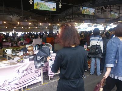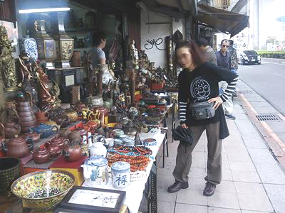 | 電脳店よりも目立っていたのは光華市場の手前にあった野菜・食材市場。(上・左)大勢の人々が集まっていた。 八徳路の交差点には確かに電気店の看板が並んでいるけど秋葉原ほどの賑わいはないし、典型的なオタクファッションの青年たちなど見かけない。 代わりに目立ったのはこの通りが骨董品店通りでもあることだ。故宮博物館で見たような美術品・小道具類を陳列した店が並んでいる。これはこれでマニアにはたまらないだろう。 |