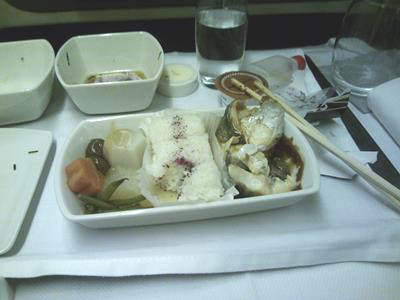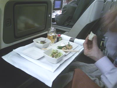 するとやっぱり腹が減ってくる。そこへ待望の機内食。左の前菜から始まって各種のパン、ビスケットなどが出る。