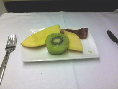 その後、メインディッシュは牛・豚・魚が選べる。私たちの選んだのは鯛の揚げ物だった。(下・左)最後にケーキ、プリン、フルーツのデザートが選べる。 当然フルーツにした。(下・右) 食後はエリック・クラプトンの最新アルバム『Old Sock 』を聞きながらウトウトする。 |