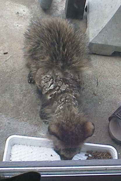 毛はボロボロ、首筋は怪我していて脱毛、皮膚はごわごわになっています。あちこち血もにじんでいます。犬に襲われたのか、車にはねられたのか。