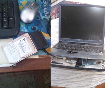 | 1月18日 2012年末、かみさん用の東芝サテライトが壊れたので柏のビッグカメラでリビング用のと同じ中古のレッツノートY7を購入。使わないノートが増えてかみさんがうるさい。思い切って三台を解体する。 最初にサテライトを解体、HDDの内容をレッツノートY7に移すことにする。全分解を試みるが、真ん中に隠しボルトがあって分割できない。しかたなく右手前パームレストの下にある2.5インチHDDだけを外した。(写真・右)それをIDE>USB切り替えアダプタで読んでみる。読めたのでY7に付け替えてデータ移動した。(写真・左) |
