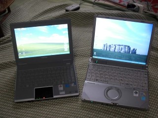 3月23日 CF-R7の可愛さに惚れたのでネットでCF-R8(写真右)を自分用に購入。東芝NB100(写真左)と並べて比較。元の値段が一桁ちがうんだから比較するのは無意味かもしれないが。 もったりしたNBと高速なR8、小さいけどずっしりのNB、軽いけど厚いR8。でも最も気になるのはキーボードの違い。NBはキーの間隙が感じにくく、キーの並びも変形で慣れない。R8は小さいながらよく出来ている。 このCF-R8はOSがXPだったので7か8(ディスクは余ってる)にしようとしたがうまくいかず、現在はLINUX(OpenSUSE)を入れている。 |