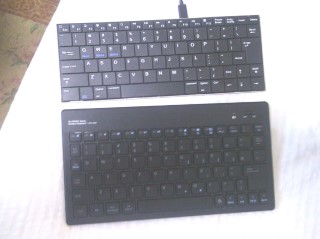 | 12月13日 アマゾンからGMYLEブルートゥース・アルミキーボードが届いた。エレコムでは大きくて理想のモバイル環境にはほど遠いと思い、もっと小さいキーボードが欲しかったので注文してしまった。GMYLEは手に取った限り、理想に近かった。 内蔵バッテリに電源チャージしつつエレコムと並べてみる。薄さと幅の狭さ、軽さはよいが、長さがむしろ長い。キーの数が多いのだ。既成のノート用キーボードを流用しているのだろう。安さを考えると仕方ないところだがこのへんもっと調整してほしい。しかし持ち運びには最適でアクオスフォンにも繋がった。理想のモバイル環境になった、かな? |