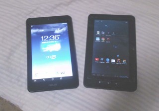 9月03日 携帯テキスト入力用のマシンを諦められない私はアマゾンでASUSの7インチタブレットMeMO Padを購入。前年購入の桃9と比べて別物かと思うほど快適性が上がっている。シングルコアとクアドコアなのだから違って当然なのだけど。 二台を並べてみた。MeMO Pad(左)と桃9(右)は重さが100gも違うし厚さが半分くらいに感じる。スクリーンはMeMO Padのほうが美しく、ちょっと広い感じ。ただ、桃9のファームウェアを最強にしていることもあり、こうして見比べてどこが違うかと言われてもそれほど差異は感じない。動かしてみてやっと分かる。 |