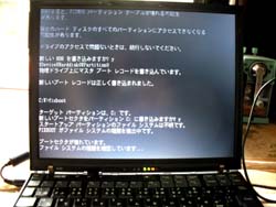 | どうやらHDDが死んだらしい?と思いながらも、復旧作業をします。 ブートレコードの書き換えをやるとうまくいったので、もしかしたら?と思ってチェックディスクをかけると、無情にも 「ブートセクタは壊れています。 修復不能のファイルが複数あります」 というメッセージが出てしまいました。これはもうダメだ、とあきらめます。 |