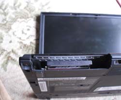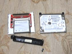 | シンクパッドはかんたんにHDDが外せるようになっています。ネジを一個取り、カバーごと引き出し、カバーから外すとちっちゃい1.8インチHDDが出てきます。ボードにCFカードを刺してカバーに乗せて見ますと、かなり小さくてネジ止めするところがありません。ネットでは「キーボードと上部カバーを外さないと取り付けられない」というコメントが書かれており、ちょっと心配になります。 | |||