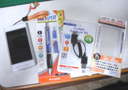 | ガラパゴスを使うための小道具を100均で買って来ました。右から液晶保護フィルム、ソフトバンク用携帯コード、スタイラス内蔵ボールペンです。フィルムはサイズが小さく、買い直しになりました。(3.5インチ用だった) 携帯コードは充電用に必要で、これがないと専用ACアダプタを購入しないといけなくなるのです。 |
