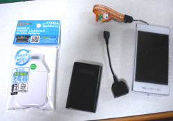 | ソフトバンク携帯用予備バッテリだと充電用コードアダプタ一本でつながります。一日使う場合はシンプルにまとまります。もっとも長期の外出のときにはUSB充電器を含めてみんな持っていくことになりますが。 | ||
