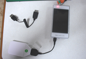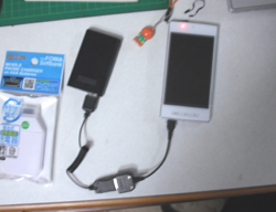 | タッチダイアモンド用の予備バッテリは「普通のUSB」です。なので、ソフトバンク用携帯コード、ガラパゴス充電用コードアダプタをダブルで接続しないと働きません。普通のUSB充電器にもこうしてダブルで接続することになります。 | ||