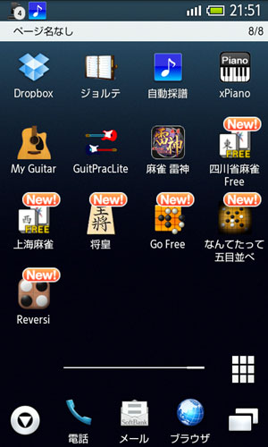 アンドロイドには豊富なソフトがあります。これはソフト配布サイトから持ってきたフリーソフトたち。麻雀・将棋・囲碁の定番ゲームも無料で、鼻歌をMIDIに変えてくれるソフトもありました。 本体をピアノに変えるソフトはなかなか優れていましたが、ギターはメリハリがなくて使えないようです。 |