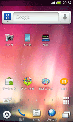 | 上がデスクトップ画面。画面キャプチャーは電源ボタンとホームボタンを一緒に押せば簡単に出来ます。 壁紙は華やかなオーロラです。すぐ使えないと役に立たないカメラ・メモ・辞書のショートカットを置いています。 上のグーグル検索窓は音声入力で、これが慣れるとすごく便利だという声がありました。 |