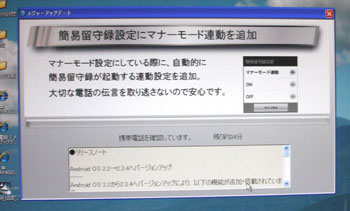 10/7からガラパゴスのアンドロイドOS2.2から2.3へのメジャー・バージョンアップサービスが開始されました。 それに関しては2チャンネル上では半年前から話題になっていましたが、いよいよその時になりました。 >メジャーアプデ来てる >人柱逝きまーす! >人柱様よろしくお願いします というテキストが流れます。 |
