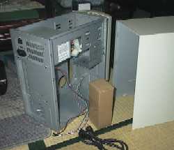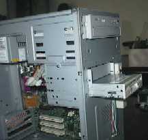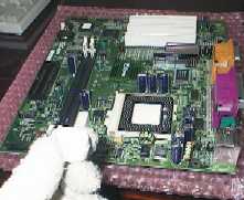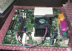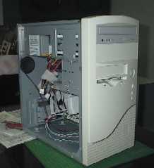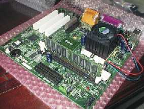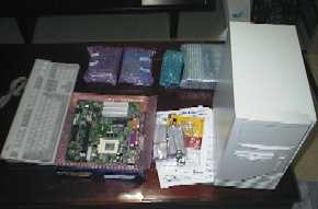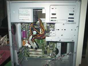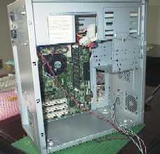 一応の完成です。(右)一般的にはこの後にビデオボードとサウンドボードの取り付けがあるのですが、このマザーボードは両方の機能とも内蔵しているので省略できます。3つあるPCIバスも自由に使えます。