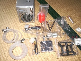 ケースを開けて中身を取り出します。点数が多いですが、Pentium用やアスロン64用の取り付けパーツもあるので、使わない部品もかなりあります。 ラジエータ&ポンプボックスはどう見てもスピーカですね。 |