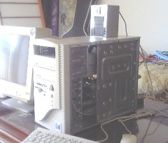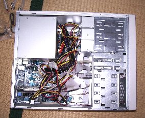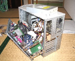 | 取り付け準備のためデスクトップを和室に運びます。ケースを開き、一応内部取り付けの余地を探りますが、この密集度合いではとても余裕がなく、外部取り付けしかないことがわかります。 | ![]() |