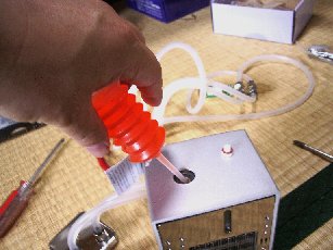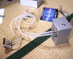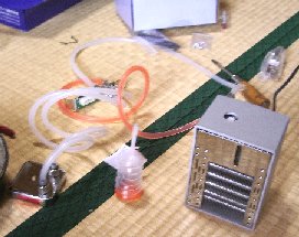しかしこれを注入するのが大変でした。不凍液が入っていたケースはひ弱で、スポイトのかわりになりません。力を入れて絞ってみても水を吸い上げないのです。 しかし他に道具がないのでちょびっとずつでもこれでやるしかありません。プリンタ・インク詰め替え用のポンプをとっておけばよかったなあ……。 満杯に近くするまで30分以上かかりました。タンクに水が入ったところで電源を入れると、なんとか動き出し、赤い不凍液とまじってピンク色の水がシステム全体に行き渡りました。 これでキットの準備はできました。 |