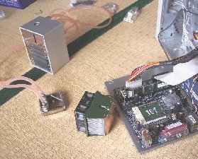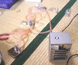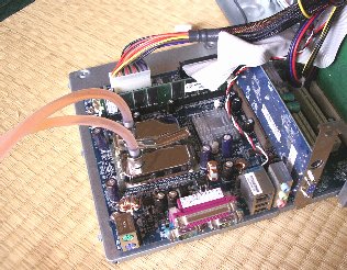 アスロンXPのダイ部分にグリスを塗り、付属の金具で水冷ヘッドをCPUに取り付けます。それほど難しい作業ではありません。すこぶる楽勝といってよいでしょう。 しかしここで大変な問題に気が付きました。 ホースを外に出す出口がないのです。PCIスロットは細くて水冷ヘッドは通りません。あらかじめPCIスロットに中継コネクタを取り付けてからホースを組むべきでした。しかしマザーボードの上で注水作業をやることを考えると、ちょっとやる気になりません。水をたらしたらマザーがいかれてしまいます。 とにかく今更後戻りできません。ホースを外したら水が漏れ出てしまいます。 |