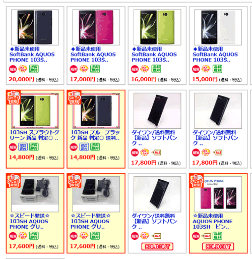2013年4月、そろそろ103SHの白ロム(野良携帯)の値段が下がってくる頃かな、と思ってネットを探します。上図は日本最大最強の携帯売買サイト「ムスビー」の5月現在のメニューです。103SHの値段は大分下がっています。4月は新品で20000円、開封品で17000円くらいが相場でした。「まだ高いなあ」というのが実感でした。 |