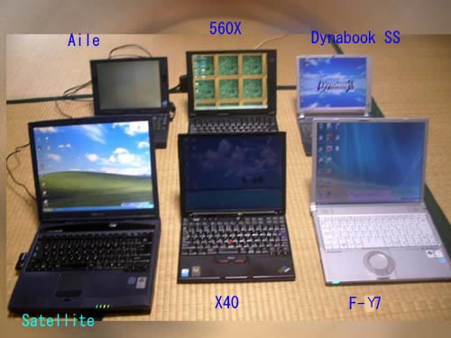 | 後列左より NEC La13-S14 Aile、IBM Thinkpad 560X、Toshiba Dynabook SS DS50-C 前列左より Toshiba Dynabook Satellite 1860SA、IBM Thinkpad X40、PanasonicLet'snoteF-Y7 |