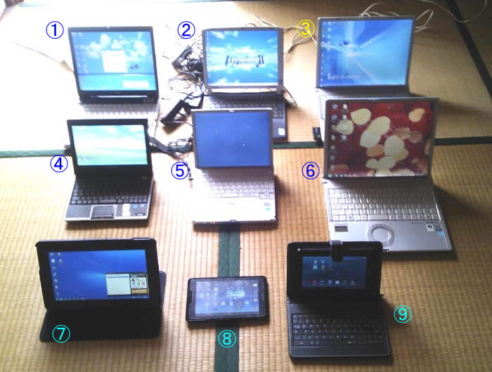 | 後列左より @NEC VersaPro VY10F 、AToshiba Dynabook SS DS50-C、BPanasonicLet'snote CF-Y7(リビング用) 中列左より CToshiba NB-100、DPanasonicLet'snoteCF-R8、EPanasonicLet'snoteCF-Y7(ユミ子用) 前列左より FDELL Latitude10、GASUS MemoPad HD7、HPloyer momo9 |
