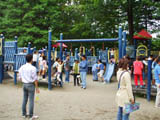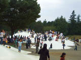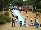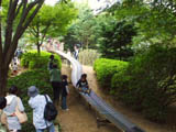 ローラー式の滑り台は小さい子供を滑らせて、下で待ち構えて記念写真を撮る親が多い。