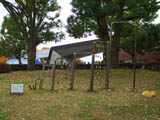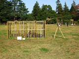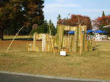 | ふれあい広場レストランの前、竹を組んで家の窓か砦風に作った造形。ほぼ実物大でかなり大きな作品。窓の裏からは人が顔をだして外を覗くにはちょうど良い。小さい窓は子供が顔を出すのにちょうどいい位置にある。後ろに見える白い椅子はふれあい広場レストランの屋外テーブルと椅子。 |