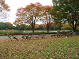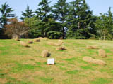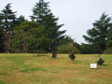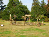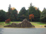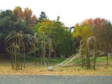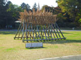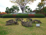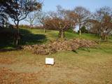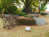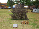 | サルスベリの木がたくさん植えてある斜面に置かれた枯れ草と枯れ木による造形。形を見るとクワガタ虫みたいに見える。枯れ草が積まれて置いてあるだけにも見えて目立たない。場所も会場横の目立たない場所なので作品に気づかない人もおおい。 |