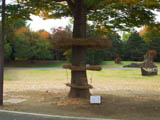 | パイプの煙の様な造形。大きさはかなり大きく高さは2メートルちかくあり、大きい輪の直径も三メートルもある。公園の造園の施設かなにかと見間違えてしまうので風景に溶け込んでしまいあまり目立たない。 |