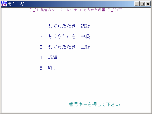 美佳のタイプトレーナもぐら叩き編メニュー画面