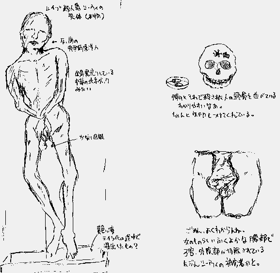 まあ、これは犯人だからしょうがないとして、奥にはどうも被害者らしい、女の腰部でちょうど子宮のあたりがえぐり取られている、ジャック風の標本もあるのだ。これ、何の罪もない被害者だよな。うむむむ、いいのか。