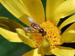 | 2002/4/28 ヒラタアブ(ホソヒラタアブ?)です.見た目はハチですが,敵から身を守るための擬態です.花の近くでホバリングしているので簡単に見つけることができます.ときどきおなかをぐっと曲げて卵を産んでいるのを見かけます. |