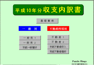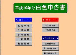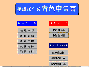 「EXCEL確定申告H10」は平成10年分の所得税の計算を行い、「一般用の確定申告書(白色申告用、青色申告用)」を作成するEXCEL97のテンプレートです。