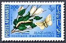 Four kinds of Agricultural day Stamp which drew Silkmoth from Afghanistan were issued in 1963. The number of designs is one and they are four kinds of different colors. One kind of Agricultural day Stamp which drew Silkmoth also were issued in 1966.